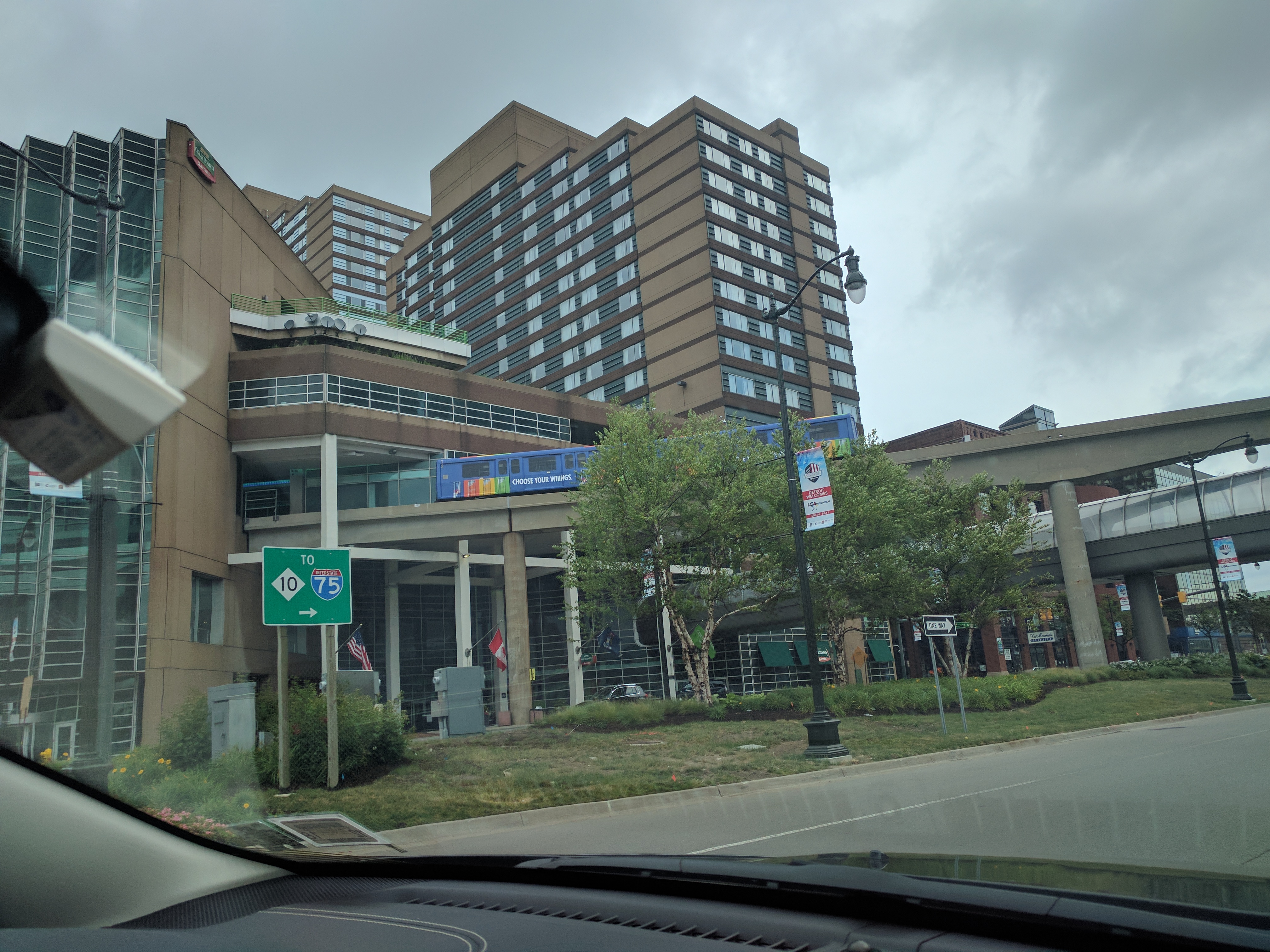 We got up and Marge had prepared and awesome breakfast for us. Soft boiled eggs, toast, cantalope, cranberry juice. We are now enroute to #IndianRiver in upper Michigan. Instead of bypassing Detroit, we went through a bit of downtown Detroit. I found it interesting that they have something called a people mover that goes around the city up above.