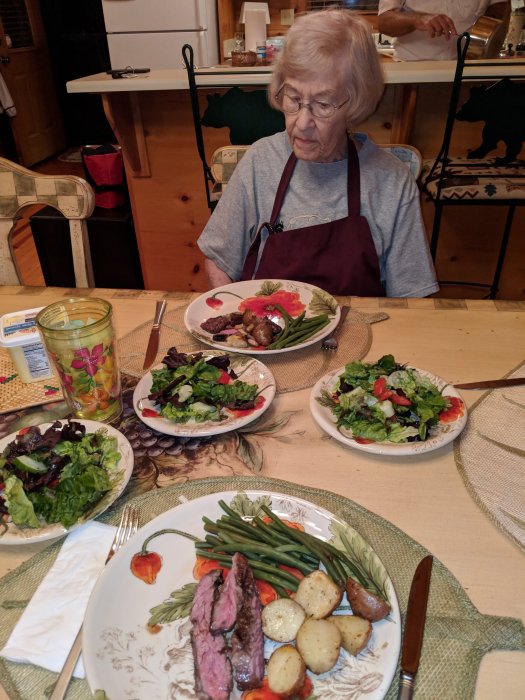 After we got back to the chalet…Scott grilled steak while Mom and I made salad, potatoes and green beans.